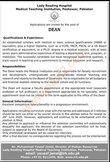 Lady Reading Hospital, a leading Medical Teaching Institution (MTI) in Peshawar, Khyber Pakhtunkhwa (KPK), is inviting applications for multiple medical and academic job positions. These latest government jobs offer a great opportunity for qualified professionals to join a reputable healthcare organization in Pakistan.