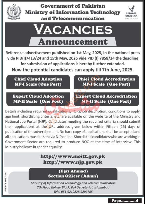 Tagged as: chief cloud accreditation jobs, cloud accreditation jobs, cloud adoption jobs, Constitution Avenue jobs, expert cloud adoption, full-time IT jobs, government IT jobs, government jobs Pakistan, Islamabad government jobs, IT careers Pakistan, IT job openings Islamabad, IT jobs Islamabad, latest IT jobs 2025, Ministry of Information Technology & Telecommunication jobs, MOIT job advertisement, MOIT jobs Islamabad, MOIT vacancies